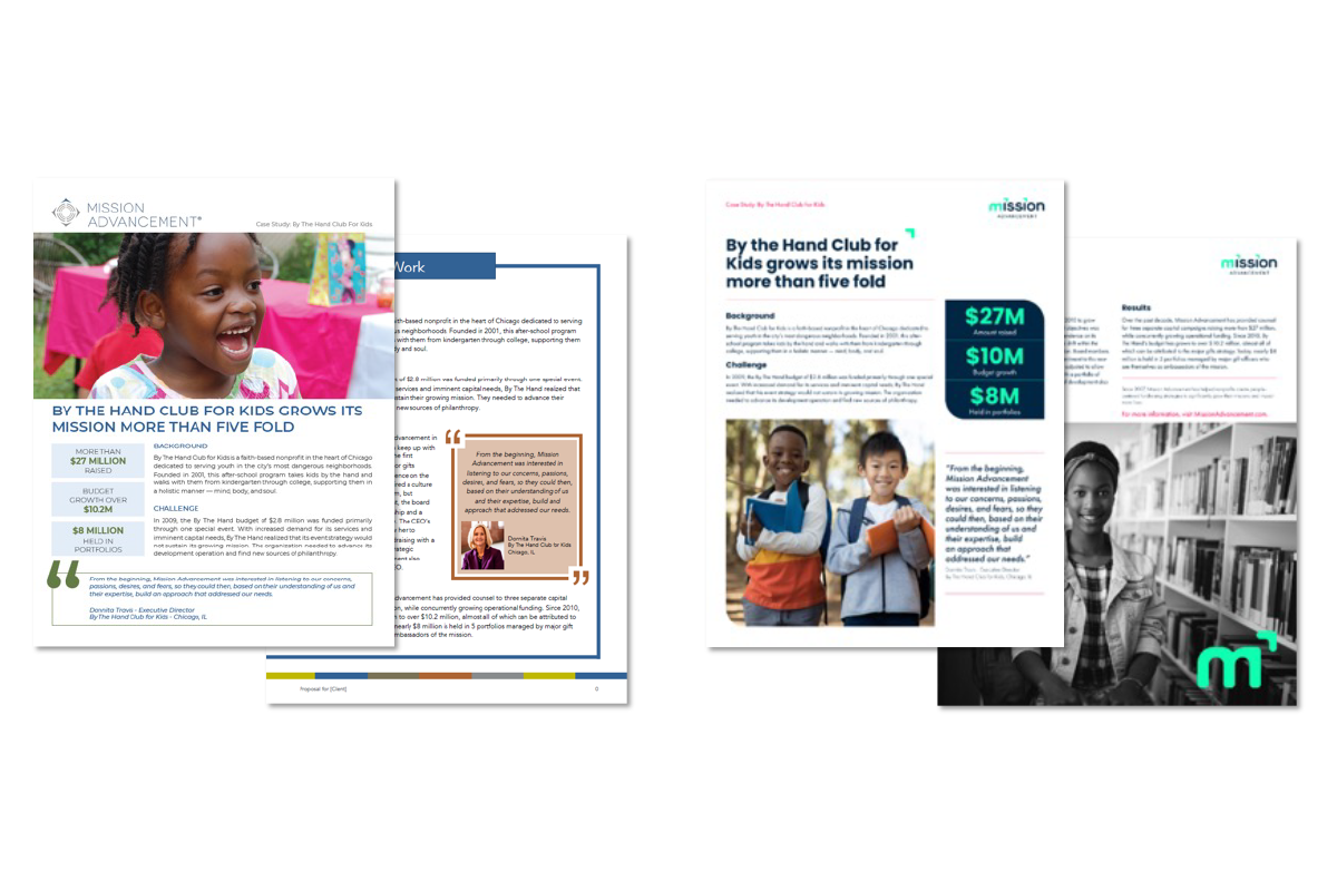 Brand messaging > Your mission is worth advancing. And fully funding that mission takes more than passion and hope. It takes paving a clear path toward your grander vision – with people-centered fundraising that pays for itself. Mission Advancement helps you inspire greater generosity through deeply intentional donor relationships. We don’t push low-return fundraising gimmicks that hide your mission, like impersonal raffles or pricey parties (though we do like parties). We help you put people first, pure and simple. Because investing in relationships leads to impact that lasts.